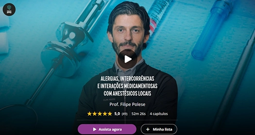 Se você quiser saber mais sobre a possibilidade de Alergias, Interações medicamentosas e Intercorrências relacionadas a Anestesia Local, assista o vídeo abaixo com uma parte da aula que fizemos especialmente para o iDent Brasil, nela conversamos mais detalhadamente sobre estes temas, procurando estabelecer um método para Diagnóstico diferencial e Tratamento destes episódios no consultório odontológico. O link da aula completa esta logo abaixo, espero que gostem!